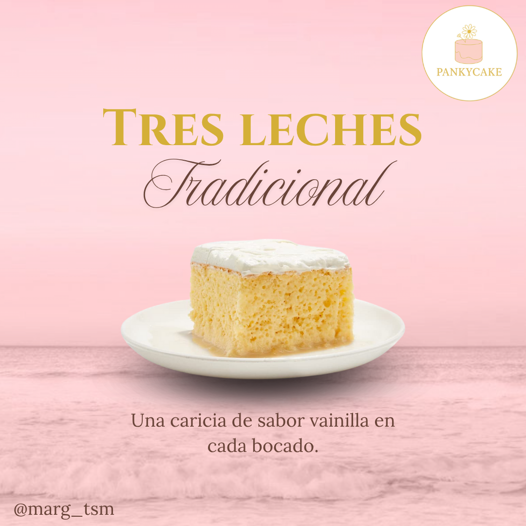Un postre tradicional que nunca falla. Nuestro pastel tres leches clásico está elaborado con un bizcocho esponjoso bañado en una mezcla perfecta de tres tipos de leche, que le aporta una suavidad inigualable. Cubierto con crema batida ligera y un toque de canela, es ideal para quienes aman lo auténtico y reconfortante.